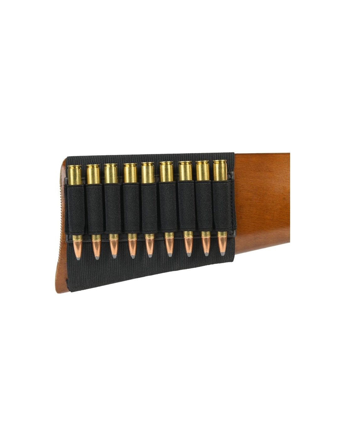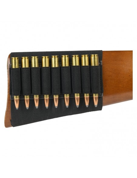 100 % polyester, permettant de transporter 9 munitions de calibre rayés. Adaptable sur toute les crosses ne comportant pas de busc réglable.