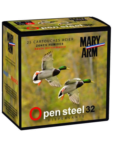 L'Open steel 32 dispersante est chargée d'un croisillon positionné à l'intérieur d'une bourre "spéciale acier" qui lui permet d'obtenir, à distance égale, 40% de dispersion supplémentaire par rapport à une cartouche 32 grs acier classique. Elle doit être tirée dans des fusils chambrés 70 mm éprouvés "steel shot" 1320 bar. Cette cartouche dispersante très performante entre 15 et 30 m, est conseillée pour chasser en zone humide, au "cul levé" devant soi, ou pour la "passée du soir" au canard, ou pour les "poses rapprochées" en huile.