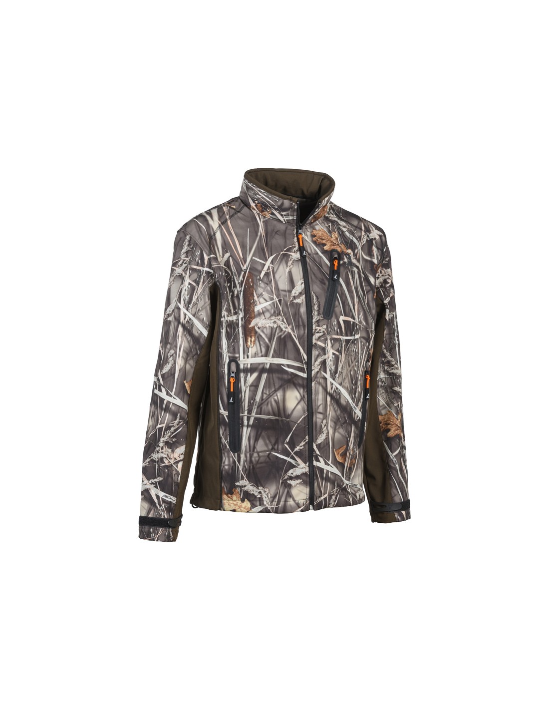 Softshell triple couches, tissu extérieur 97% polyester, 3% élasthane, membrane polyuréthane laminée, imperméable et respirante. Tissu intérieur polaire 100% polyester. 1 poche poitrine zippée, 2 poches repose-mains zippées, cordon de serrage à la taille, capuche intégrée au col, carnier avec doublure étanche et lavable.